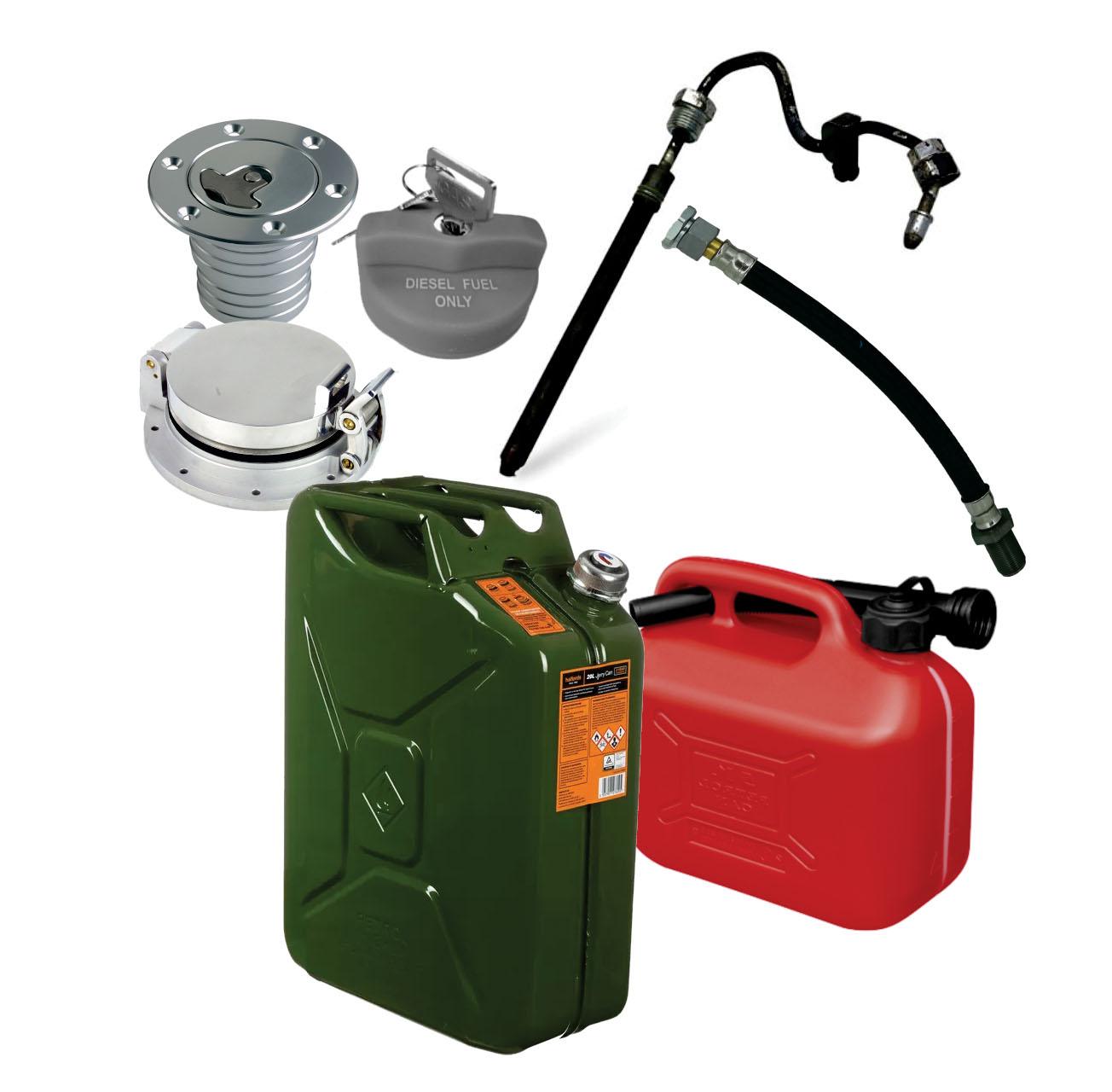 We have various accessories for your trucks fuel and other liquid needs. We have replacement fuel caps, markers for the fuel areas. We have metal fuel containers, water containers, pipes and more.